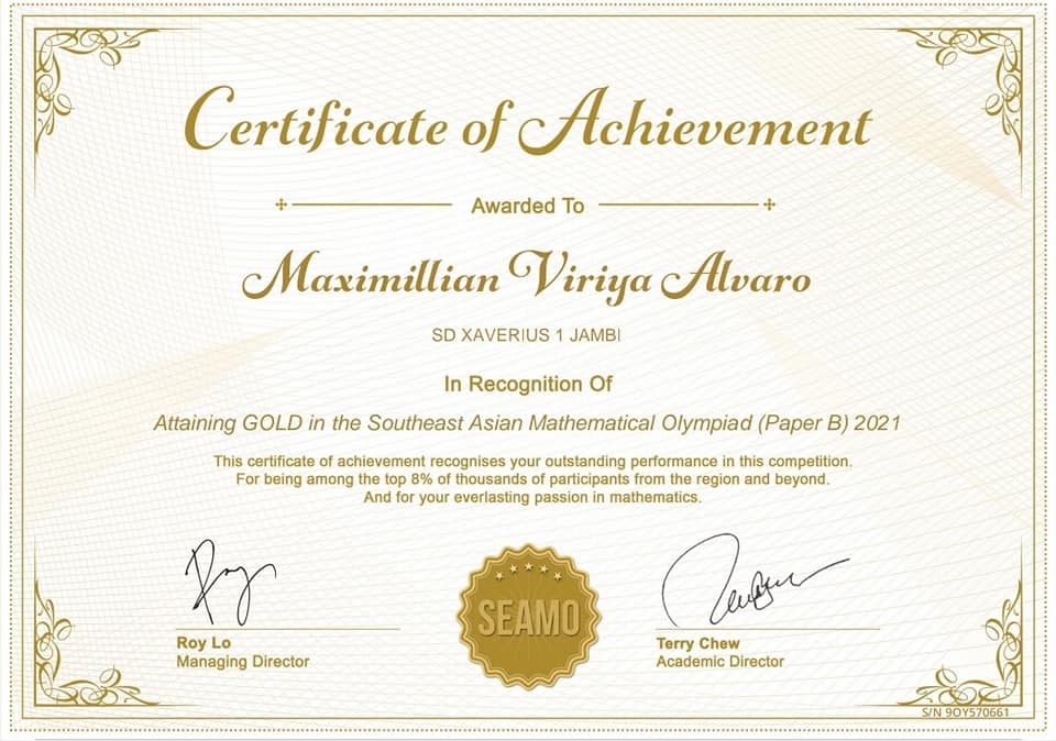 SDS Xaverius 1 Jambi Meraih medali emas pada Olimpiade Matematika se Asia Tenggara (SEAMO) Tahun 2021